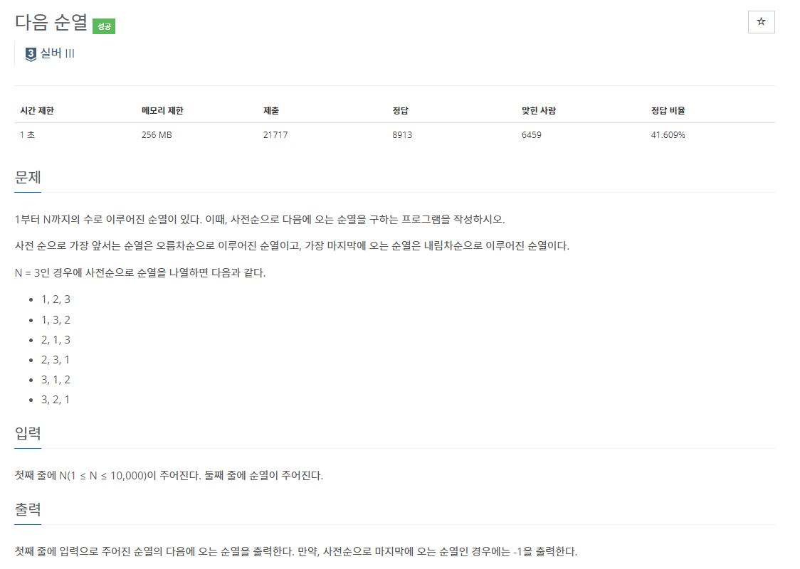 첫째 줄에 입력으로 주어진 순열의 다음에 오는 순열을 출력한다. 만약, 사전순으로 마지막에 오는 순열인 경우에는 -1을 출력한다.