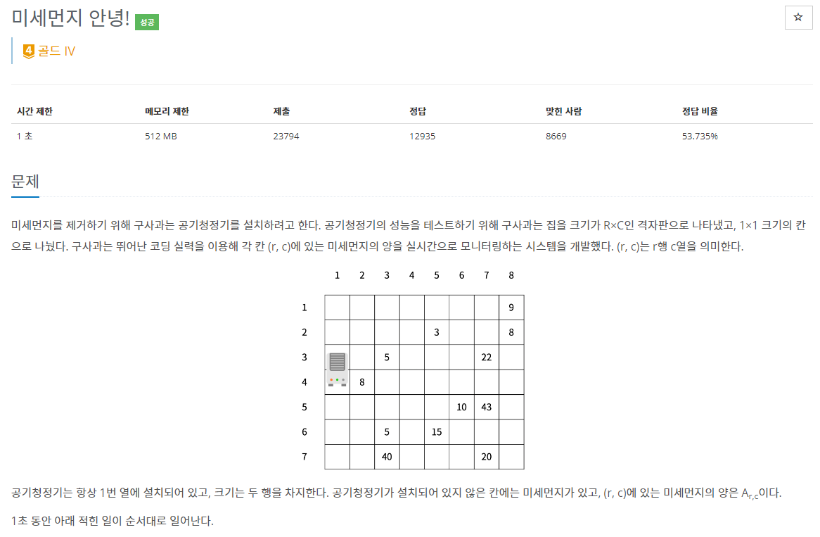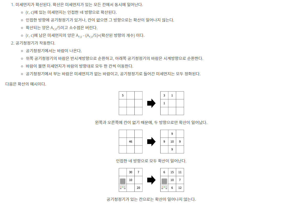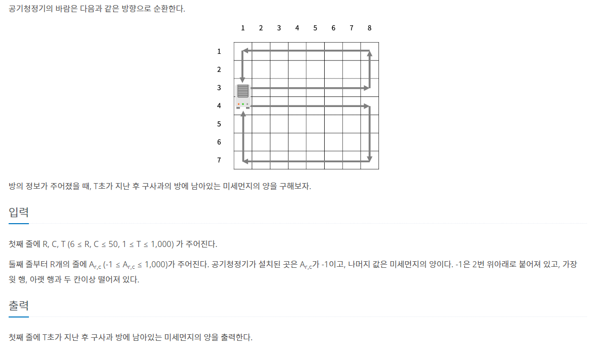 미세먼지를 제거하기 위해 구사과는 공기청정기를 설치하려고 한다. 공기청정기의 성능을 테스트하기 위해 구사과는 집을 크기가 R×C인 격자판으로 나타냈고, 1×1 크기의 칸으로 나눴다. 구사