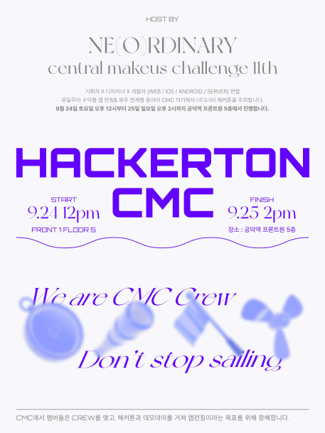 CMC에서 주최한 Ne(o)rdinary 해커톤이 9.24~9.25 무박 2일로 진행되었다. 참여 가능 대상은 CMC,UMC, 라이징 캠프, 알고리즘 캠프, 라이징 프로그래머 수료생 및 챌린저이다. 나는 저번학기에 UMC 2기를 수료했었기 때문에 참여가 가능했다. 나는 아이디어톤과 같은 비교적 가벼운 대회에는 참가해보았지만 해커톤은 참여해본 경험이 없었다. 그래서 이번에 UMC를 통해 개발경험도 쌓였겠다 해서 해커톤 경험해보기 위해 Ne(o)rdinary 해커톤에 참여했다.