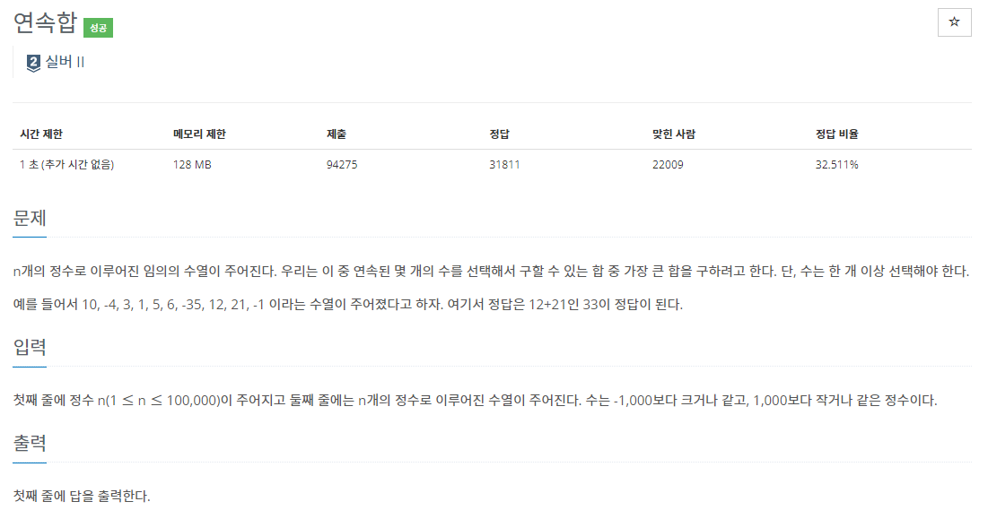 지금까지 dynamic programming 문제를 풀면서 dp배열에 마지막(dp[n])이 답이 되어야 한다는 생각을 가지고 있었다. 그래서 이 문제를 처음 풀 때도 어떻게 dp배열에 마지막이 연속합의 최댓값이 될 수 있을까를 생각해서 풀었는데 쉽지 않았다. 그래서 다른 사람들의 풀이를 봤더니 dp배열의 최댓값들을 다른 변수에 저장해 놓고 푸는 것을 확인할 수 있었다. 이 문제를 이후로 dp문제를 풀 때 더 넓은 관점에서 바라봐야겠다.
