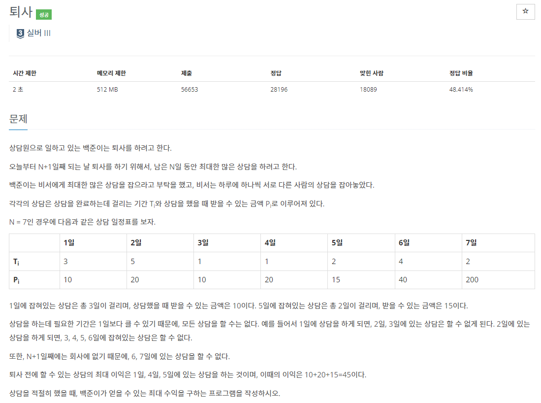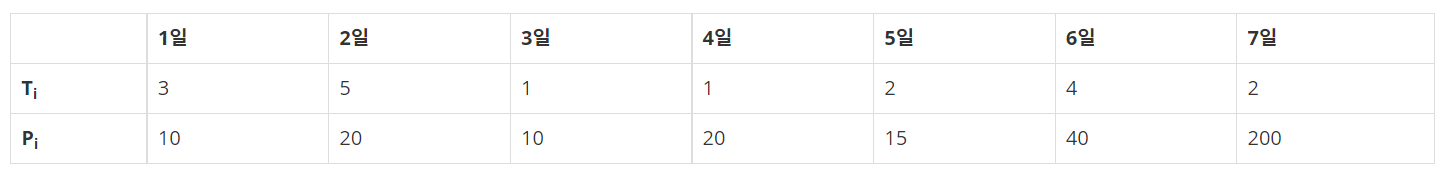 1일 - 잡혀있는 상담기간이 3일이므로 1~3일에 걸쳐 상담을 진행할 수 있다. → 지금까지 구해온 최대이익과 1일째 상담을 한 경우의 최대이익을 비교해야 한다. 1일째 상담을 한 경우의 최대이익은 35(4~7일에서의 최대이익)+10(1~3일에 걸쳐서 상담을 한 후에 얻은 이익) = 45이다. 지금까지 구해온 최대이익과 동일하므로 최대이익 = 45