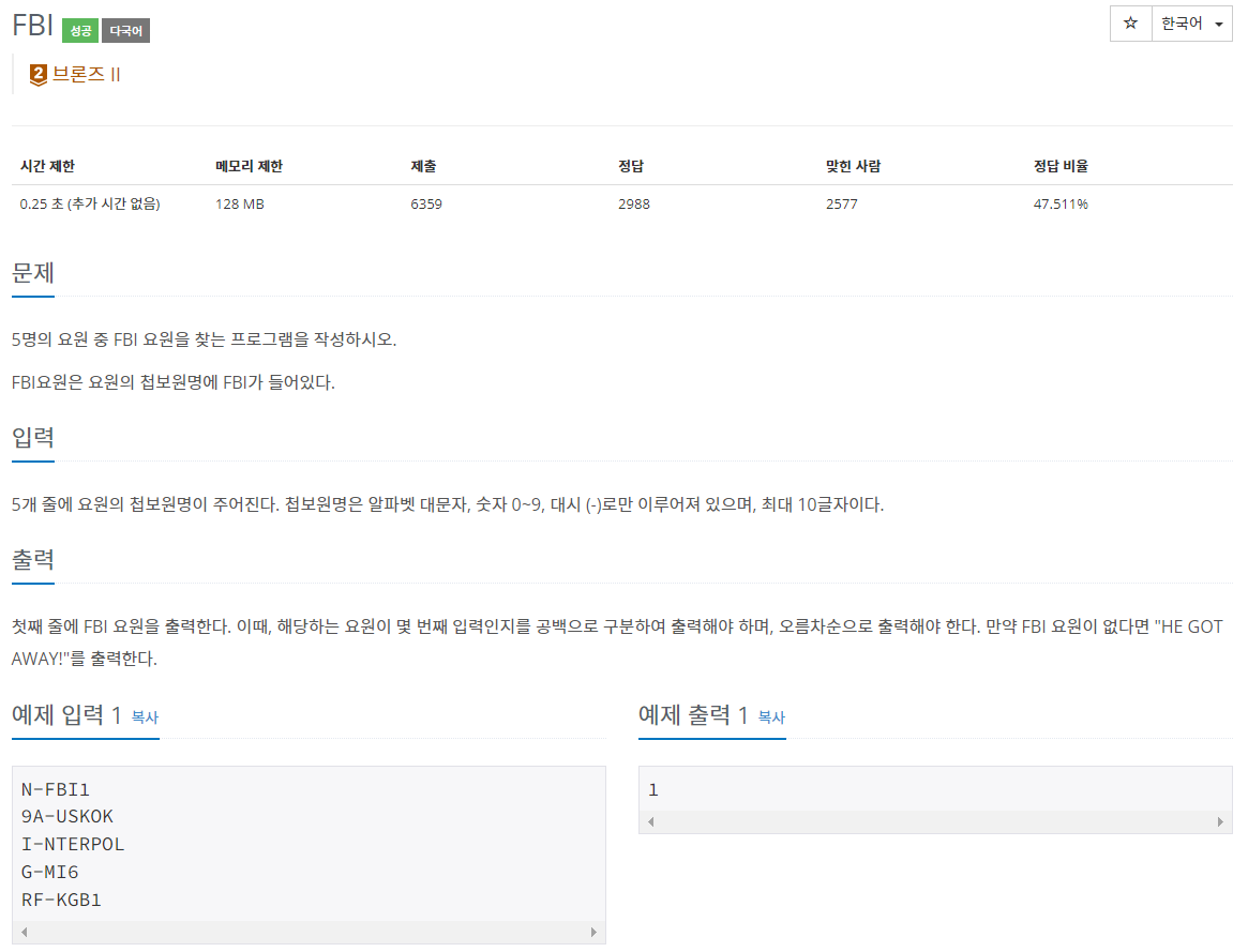 if(s.find("FBI") != -1){
