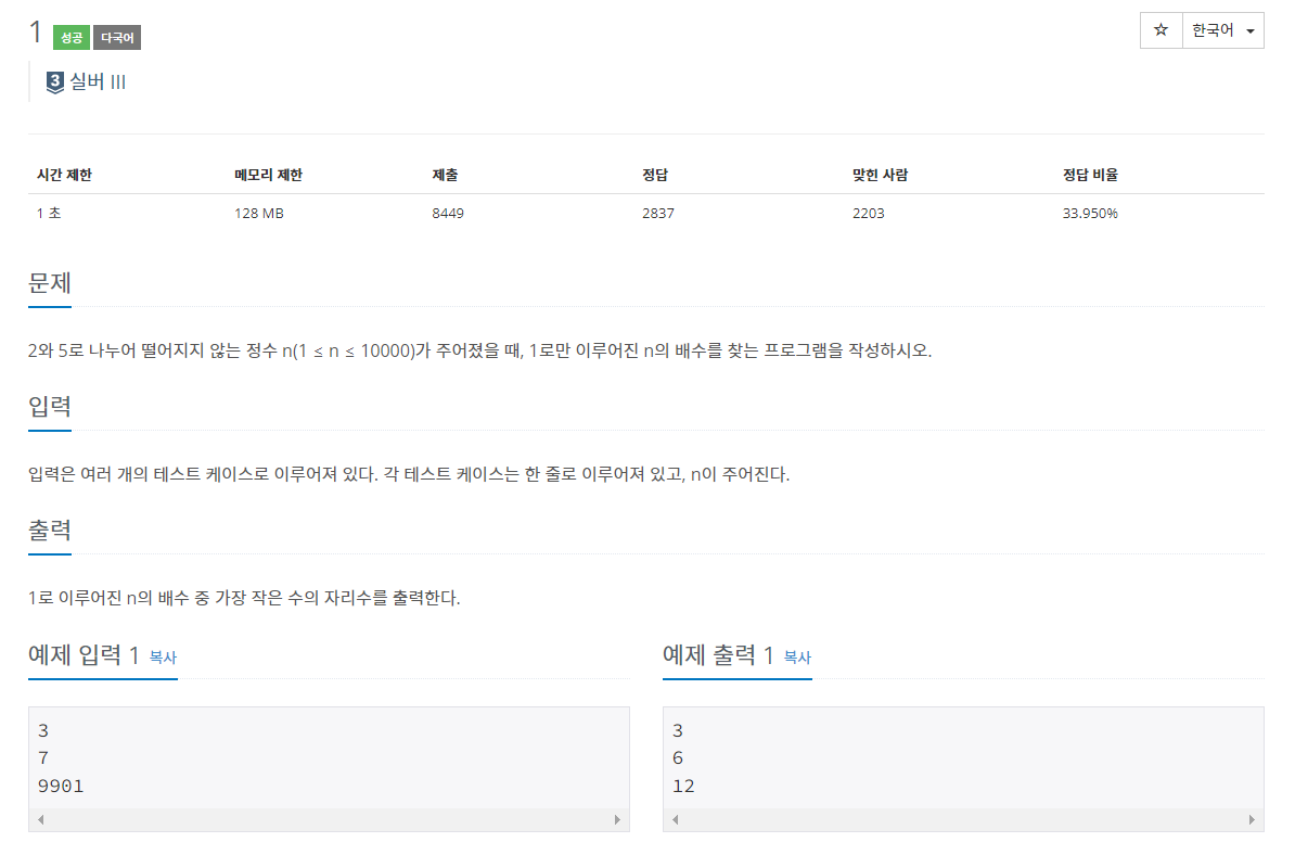 2와 5로 나누어 떨어지지 않는 정수 n(1 ≤ n ≤ 10000)가 주어졌을 때, 1로만 이루어진 n의 배수를 찾는 프로그램을 작성하시오.