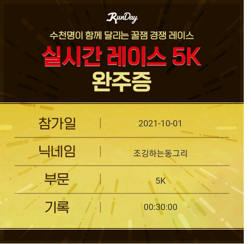 10월 1일 20:00시에 런데이에서 주최하는 10월 월간 레이스 5K에 참가했다.
