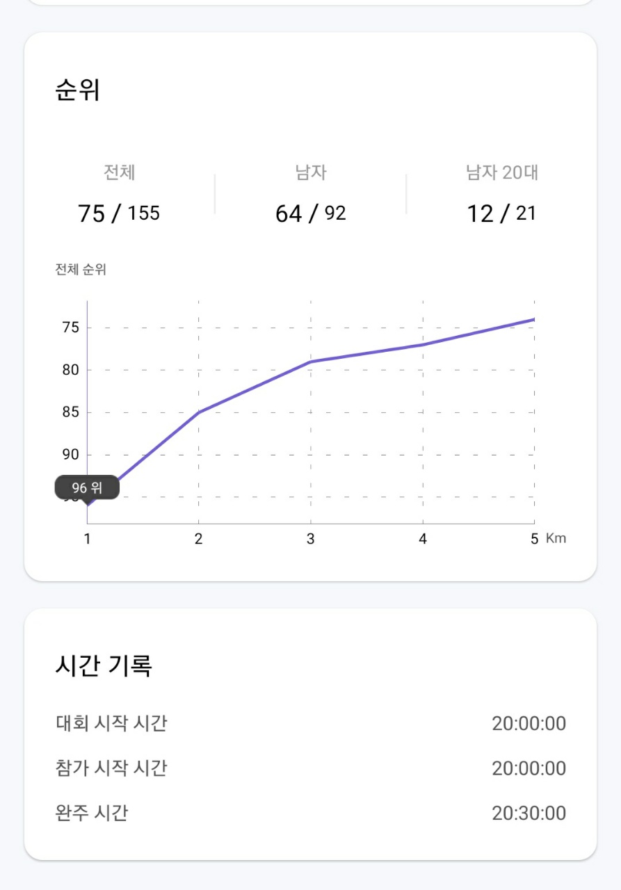 나는 그 중 전체 75등을 했고 완주까지는 정확히 30분 걸렸다.
