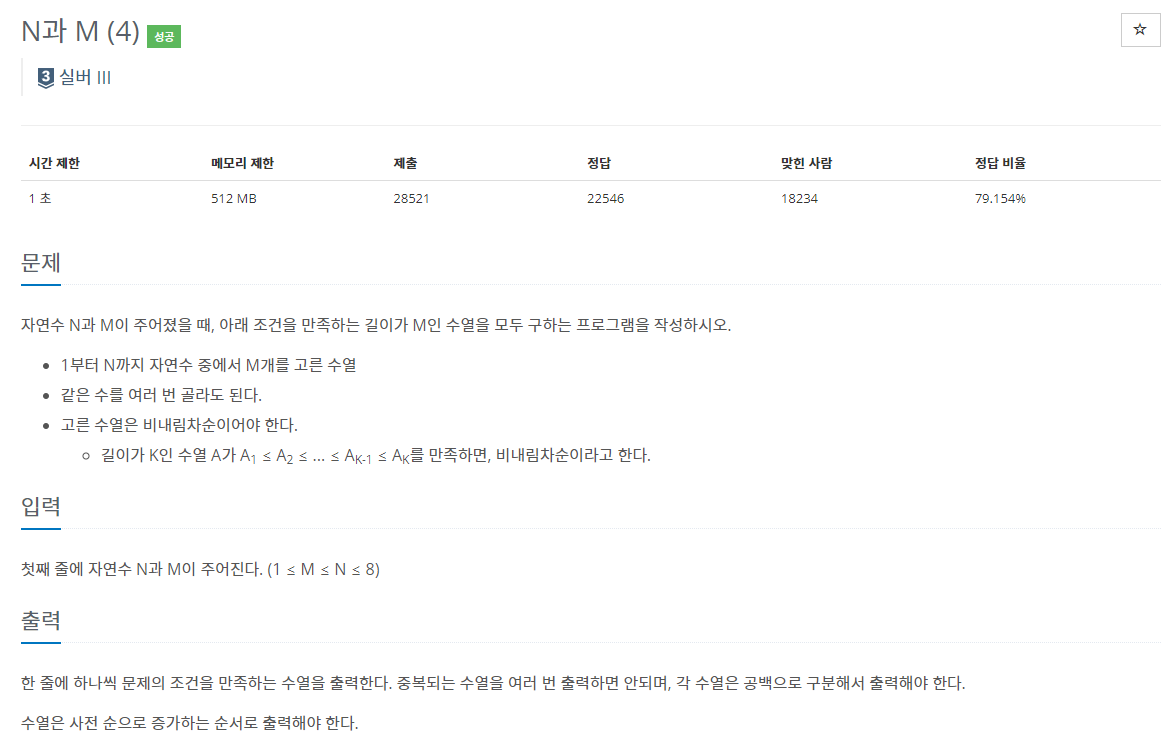 이 문제와 15649번의 차이점은 (1)중복이 허용되고 (2)비내림차순인 수열이 출력되어야 된다는 것이다. 15650번과 15651번의 해결방법을 같이 적용하여 풀 수 있는 문제이다.