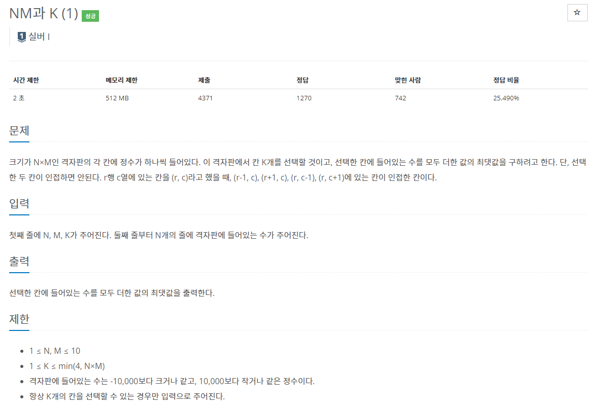 크기가 N×M인 격자판의 각 칸에 정수가 하나씩 들어있다. 이 격자판에서 칸 K개를 선택할 것이고, 선택한 칸에 들어있는 수를 모두 더한 값의 최댓값을 구하려고 한다. 단, 선택한 두 칸이 인접