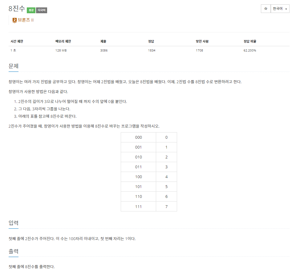 창영이는 여러 가지 진법을 공부하고 있다. 창영이는 어제 2진법을 배웠고, 오늘은 8진법을 배웠다. 이제, 2진법 수를 8진법 수로 변환하려고 한다. 창영이가 사용한 방법은 다음과 같다. 2진수의